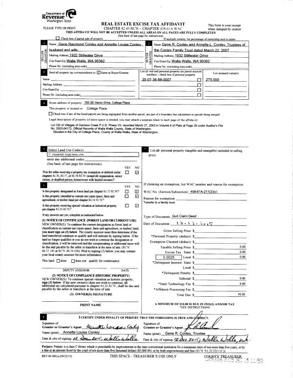 | 5 | 12/12/2015 | QCD | QUIT CLAIM DEED | CONLEY GENE RAYMOND & ANNETTE LOUISE | CONLEY FAMILY TRUST | | | $0.00 | 129336 | 2015-10688 |