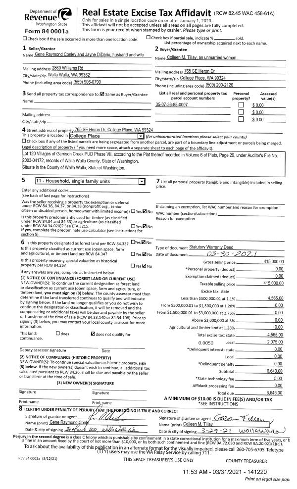 | 2 | 03/31/2021 | SWD | STATUTORY WARRANTY DEED | CONLEY GENE R & JAYNE E DIDARIO | TILLAY COLLEEN M | | | $415,000.00 | 141220 | 2021-03715 |