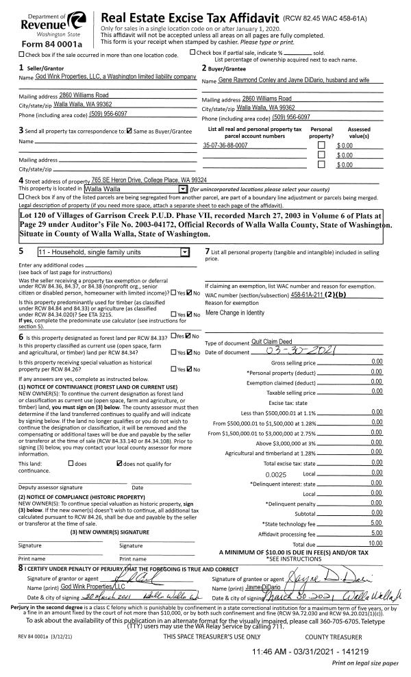 | 3 | 03/31/2021 | QCD | QUIT CLAIM DEED | GOD WINK PROPERTIES LLC | CONLEY GENE R & JAYNE E DIDARIO | | | $0.00 | 141219 | 2021-03714 |