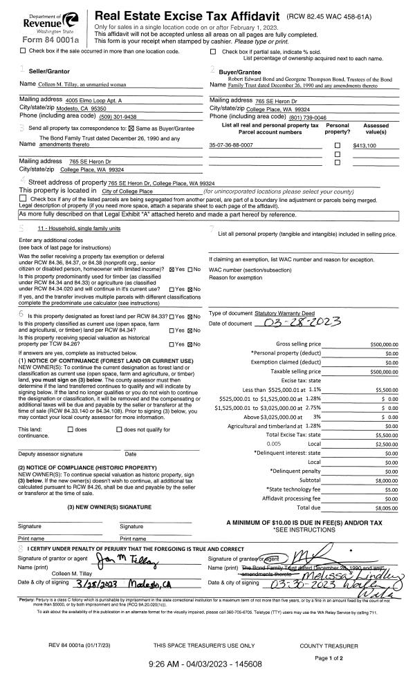 | 1 | 04/03/2023 | SWD | STATUTORY WARRANTY DEED | TILLAY COLLEEN M | BOND FAMILY TRUST | | | $500,000.00 | 145608 | 2023-01687 |