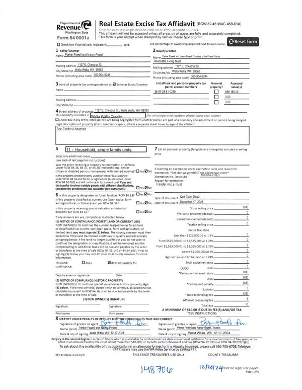 | 1 | 12/20/2024 | QCD | QUIT CLAIM DEED | POWELL PARKER & NANCY | POWELL FAMILY REVOCABLE LIVING TRUST | | | | 148706 | 2024-07345 |
