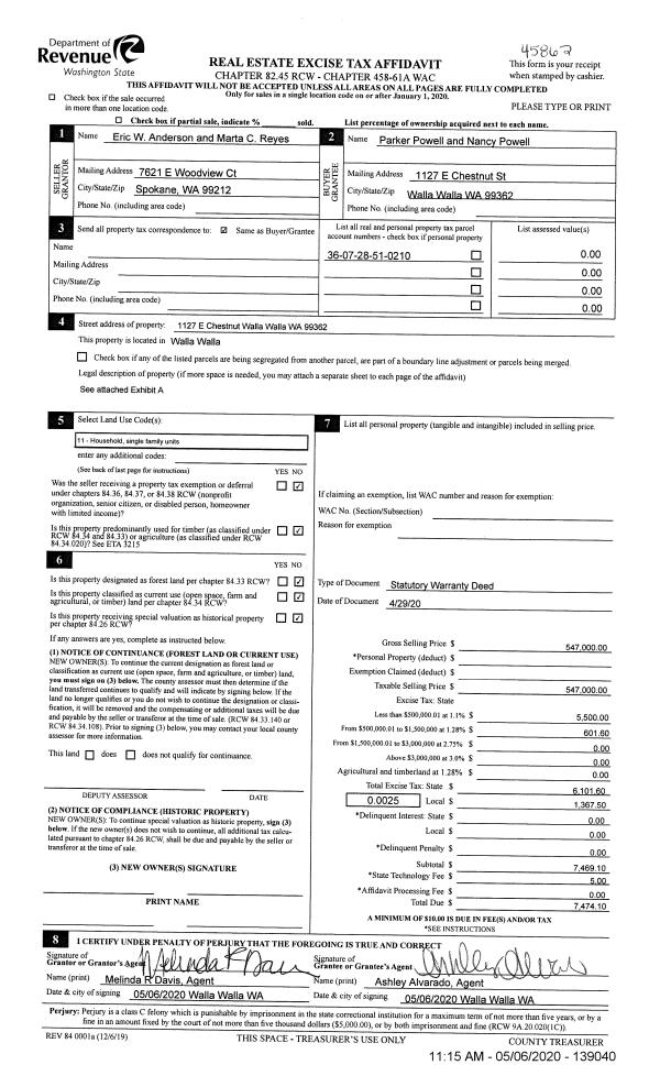 | 2 | 05/06/2020 | SWD | STATUTORY WARRANTY DEED | ANDERSON ERIC W | POWELL PARKER & NANCY | | | $547,000.00 | 139040 | 2020-03880 |