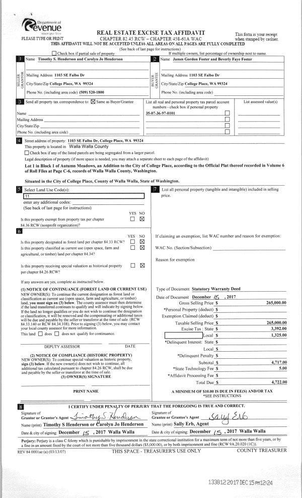 | 1 | 12/15/2017 | SWD | STATUTORY WARRANTY DEED | HENDERSON TIMOTHY S | FOSTER JAMES GORDON & BEVERLY FAYE | | | $265,000.00 | 133812 | 2017-10115 |