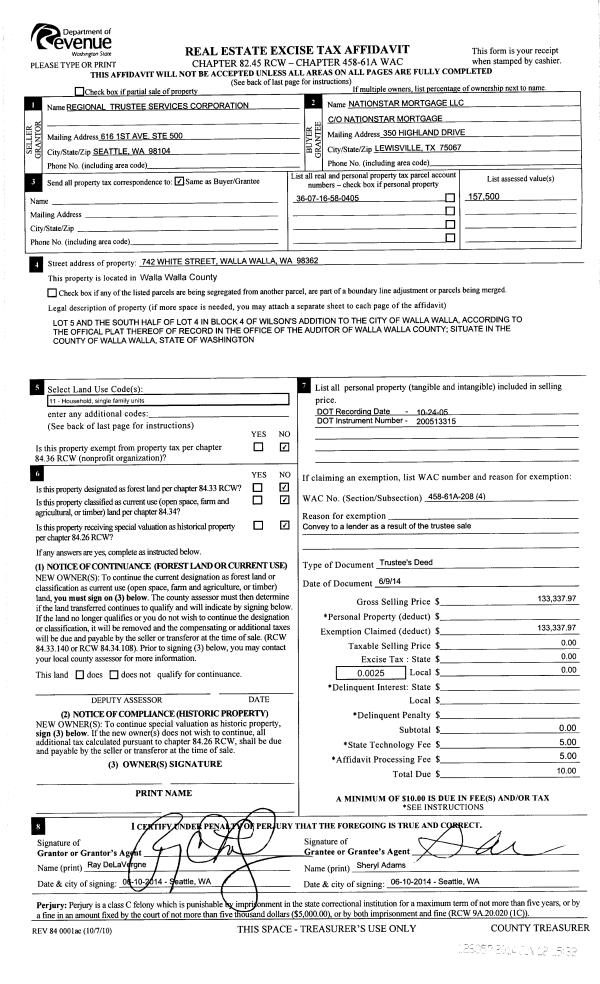 | 5 | 06/12/2014 | TRUSTEES D | TRUSTEE'S DEED | O'DELL CHRISTOPHER & LAUNA | NATIONSTAR MORTGAGE LLC | | | $133,337.00 | 126057 | 2014-04053 |