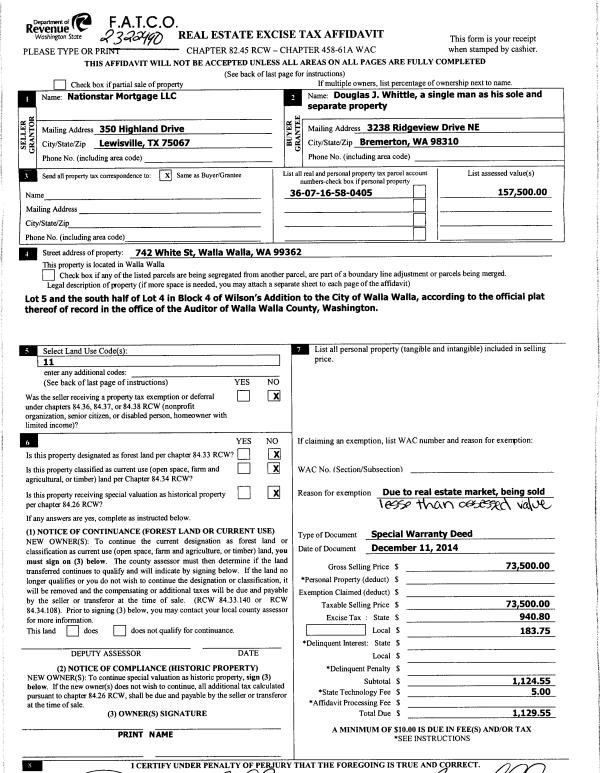 | 4 | 01/08/2015 | SWP | Special Warranty Deed | NATIONSTAR MORTGAGE LLC | WHITTLE DOUGLAS J | | | $73,500.00 | 127238 | 2015-00186 |