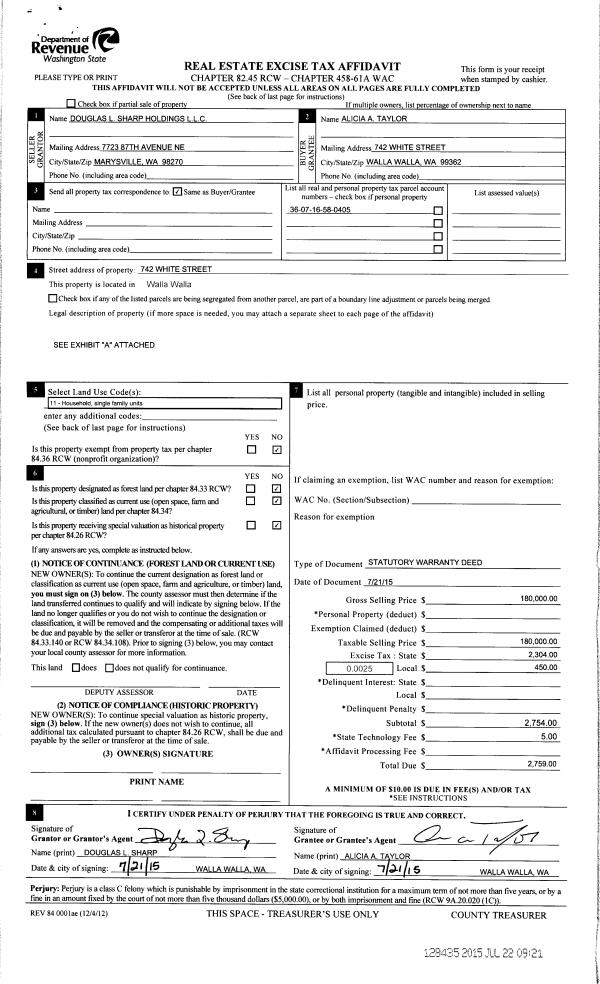 | 2 | 07/22/2015 | SWD | STATUTORY WARRANTY DEED | DOUGLAS L SHARP HOLDINGS LLC | TAYLOR ALICIA A | | | $180,000.00 | 128435 | 2015-06218 |