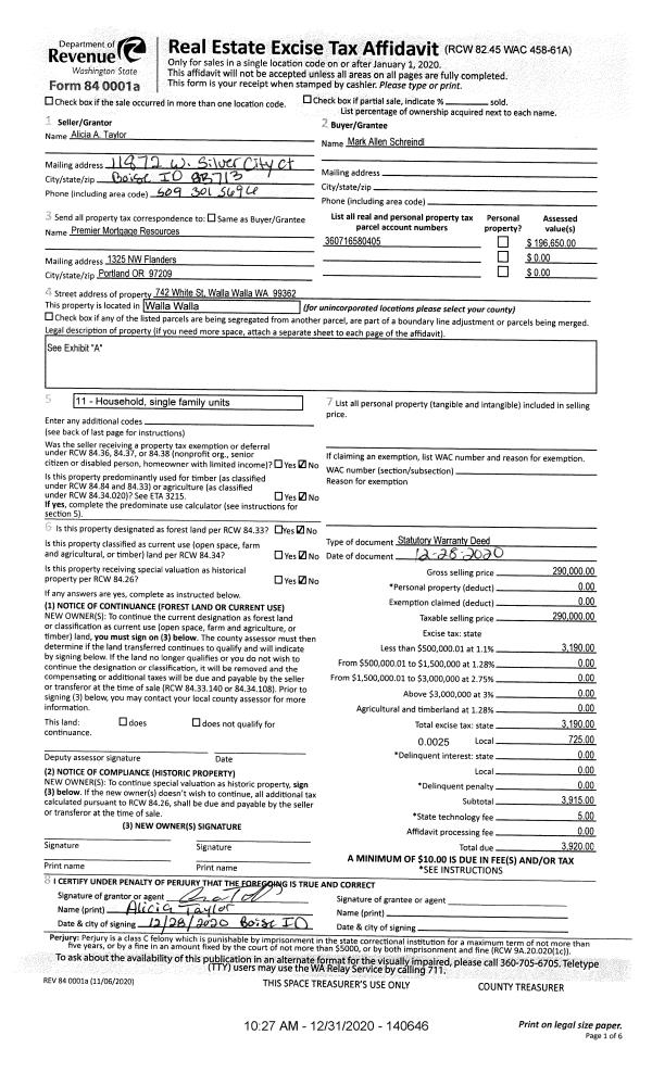 | 1 | 12/31/2020 | SWD | STATUTORY WARRANTY DEED | TAYLOR ALICIA A | SCHREINDL MARK ALLEN | | | $290,000.00 | 140646 | 2020-14015 |