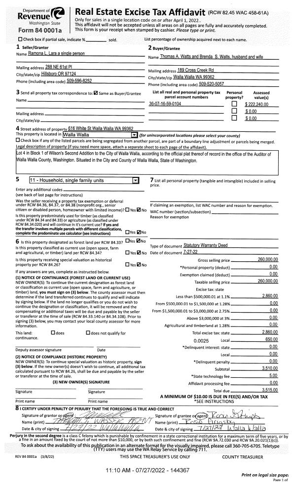 | 2 | 07/27/2022 | SWD | STATUTORY WARRANTY DEED | LARA RAMONA L | WATTS THOMAS A & BRENDA S | | | $260,000.00 | 144367 | 2022-06274 |