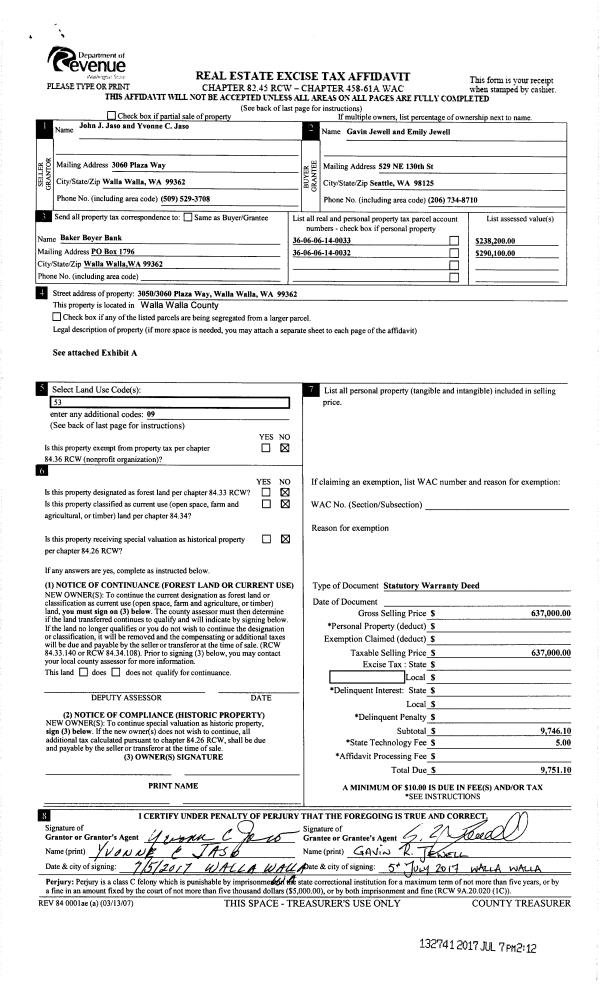 | 2 | 07/07/2017 | SWD | STATUTORY WARRANTY DEED | JASO JOHN J & YVONNE C | JEWELL GAVIN RICHARD & EMILY ALTHEA | | 2-PARCELS | $0.00 | 132741 | 2017-05219 |