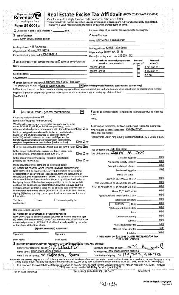 | 1 | 07/21/2023 | QCD | QUIT CLAIM DEED | JEWELL GAVIN RICHARD & EMILY ALTHEA | JEWELL EMILY | | | | 146136 | 2023-04132 |