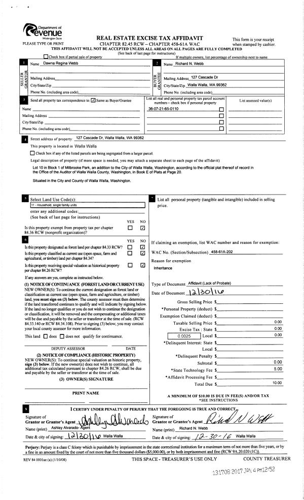 | 1 | 12/30/2016 | LOPA | LACK OF PROBATE AFFIDAVIT | WEBB RICHARD N & DAWNA R | WEBB RICHARD N | | | $0.00 | 131708 | 2017-00094 |