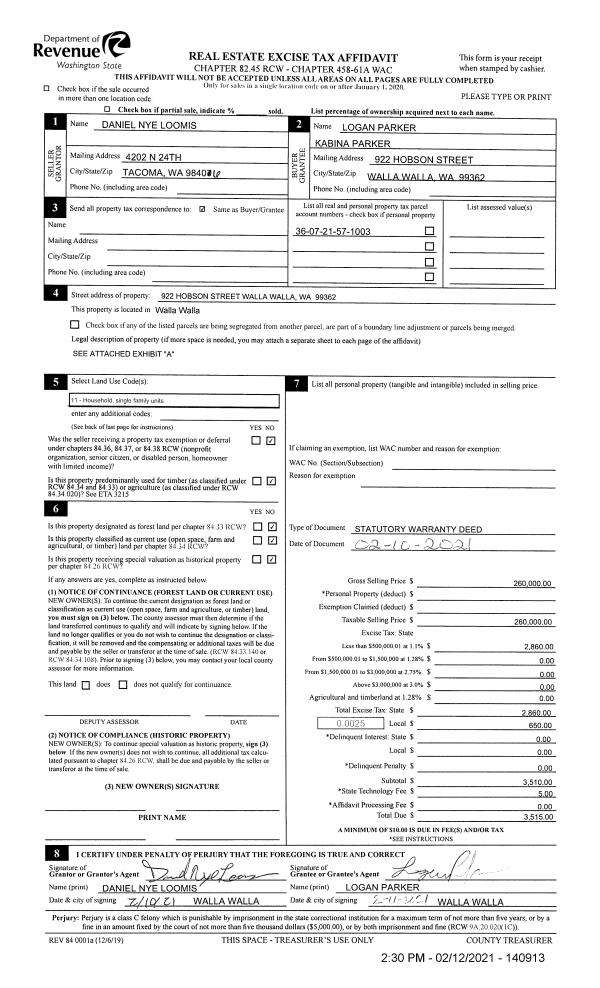 | 1 | 02/12/2021 | SWD | STATUTORY WARRANTY DEED | LOOMIS DANIEL NYE | PARKER LOGAN & KABINA | | | $260,000.00 | 140913 | 2021-01783 |