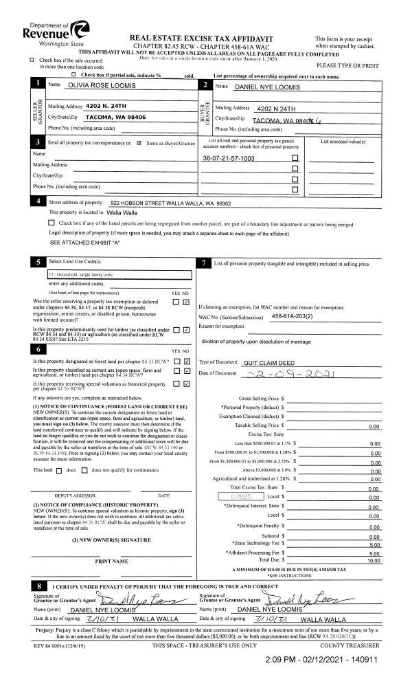 | 2 | 02/12/2021 | QCD | QUIT CLAIM DEED | LOOMIS DANIEL NYE & OLIVIA ROSE | LOOMIS DANIEL NYE | | | $0.00 | 140911 | 2021-01782 |