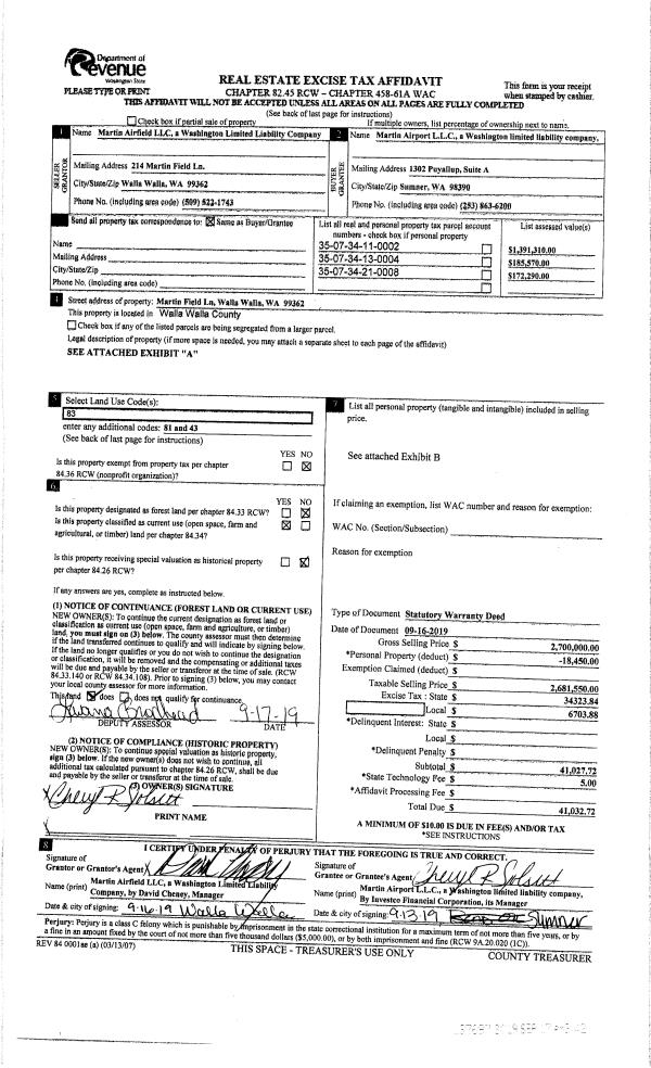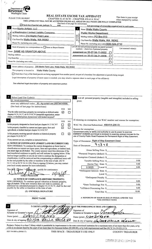 | 2 | 11/16/2018 | EASE | EASEMENT | MARTIN AIRFIELD LLC | WALLA WALLA COUNTY OF | | | | 135958 | 2018-09539 |