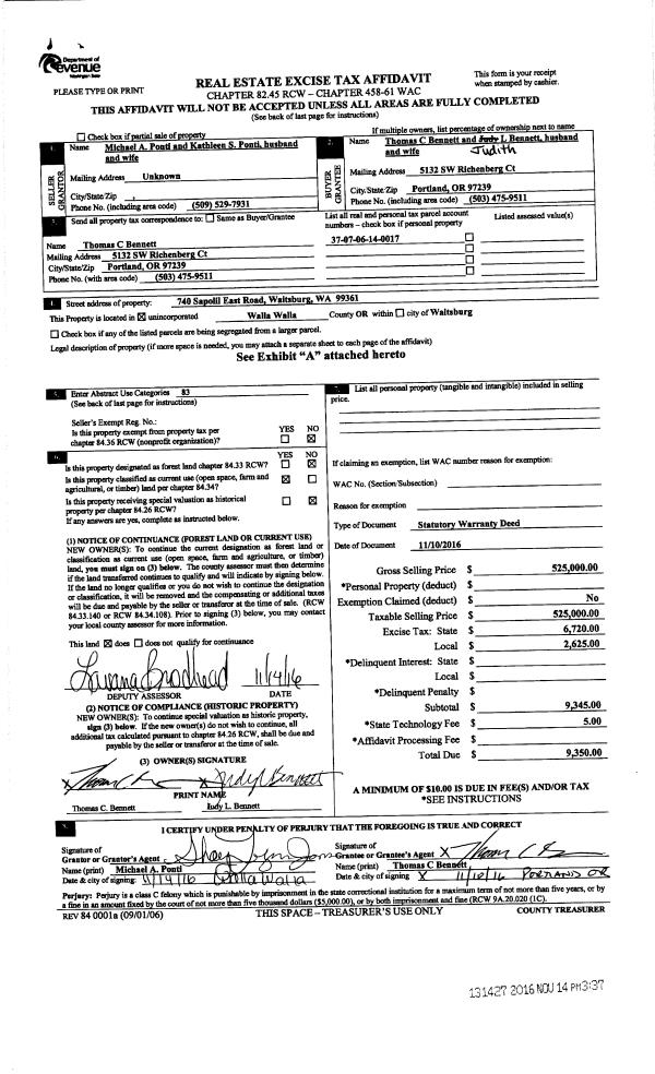 | Mailing Address: | 740 SAPOLIL EAST RD WAITSBURG, WA 99361 | % Ownership: | 100.0000000000% |