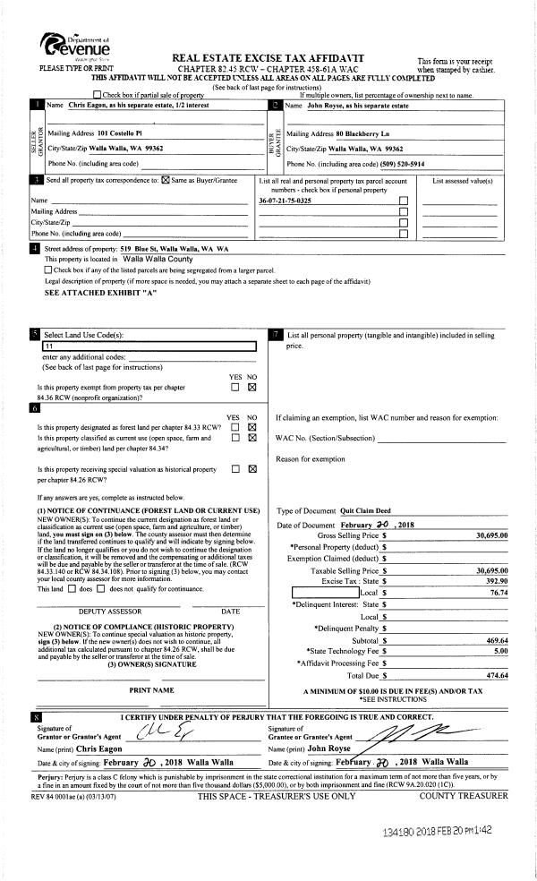 | 1 | 02/20/2018 | QCD | QUIT CLAIM DEED | EAGON CHRIS | ROYSE JOHN | | | $30,695.00 | 134180 | 2018-01417 |