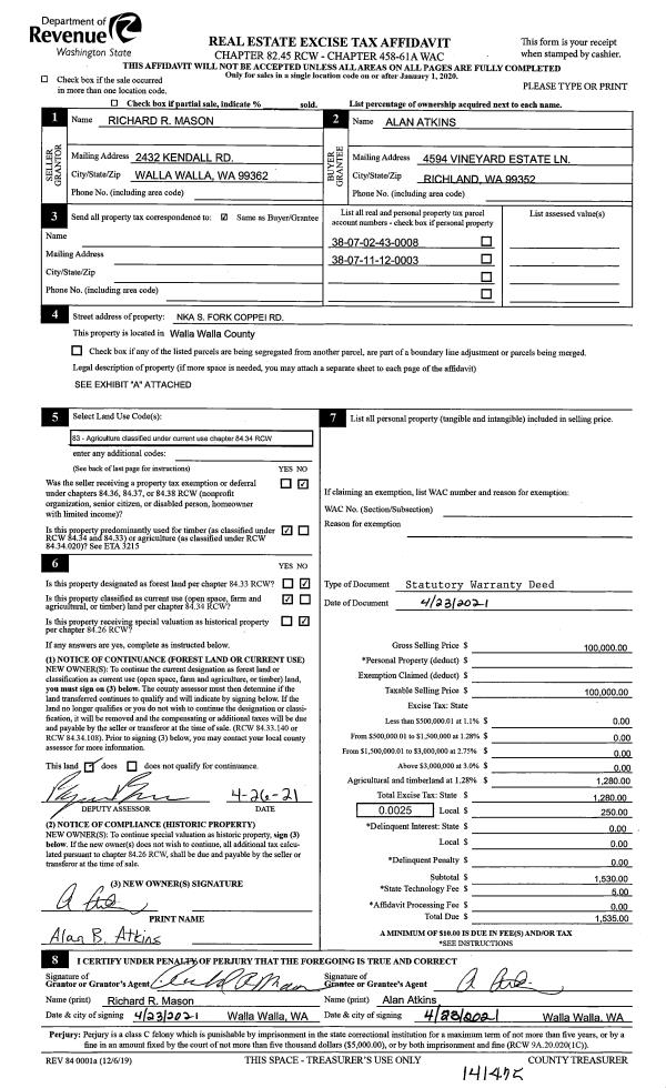 | 2 | 04/23/2021 | SWD | STATUTORY WARRANTY DEED | MASON RICHARD R | ATKINS ALAN | | 2-PARCELS | $100,000.00 | 141425 | 2021-04885 |