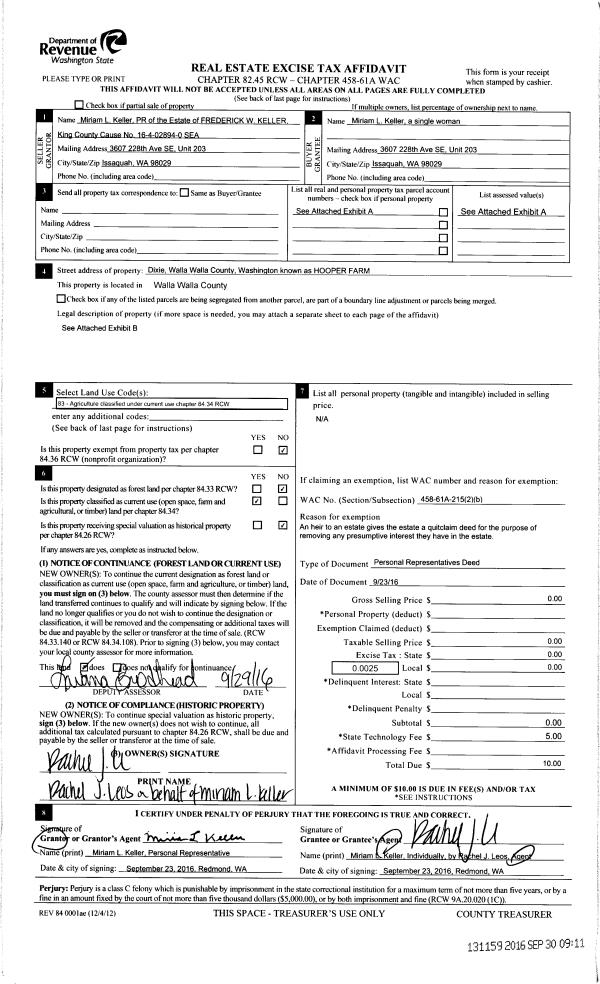 | 5 | 09/23/2016 | DPR | DEED OF PERSONAL REPRESENTATIVE | KELLER FREDERICK W | KELLER FREDERICK W ESTATE | | | $0.00 | 131159 | 2016-08051 |