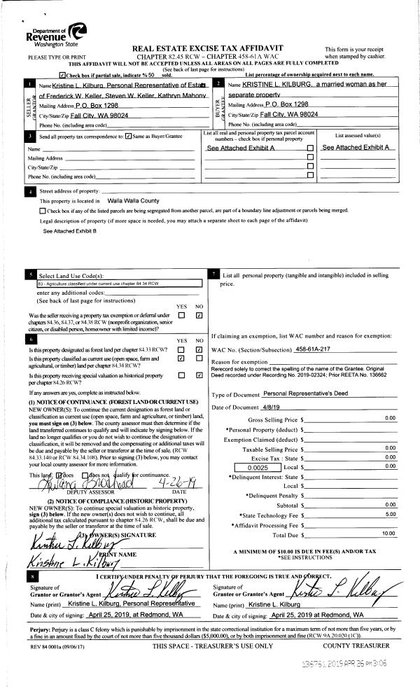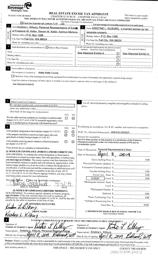| 3 | 04/08/2019 | DPR | DEED OF PERSONAL REPRESENTATIVE | KELLER FREDERICK W ESTATE & KK4 FARMS LLC | KILBURG KRISTINE L 50% | 6 PARCELS | | $0.00 | 136662 | 2019-02324 |