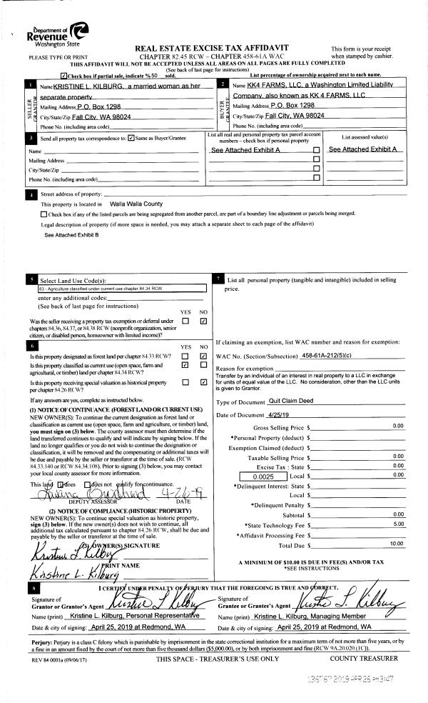 | 1 | 04/25/2019 | QCD | QUIT CLAIM DEED | KILBURG KRISTINE L 50% | KK 4 FARMS LLC | | | $0.00 | 136767 | 2019-02681 |