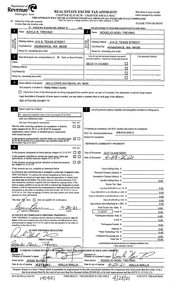 | 2 | 04/27/2021 | QCD | QUIT CLAIM DEED | TREVINO KAYLA R | TREVINO ROGELIO NOEL | | | | 141441 | 2021-04991 |