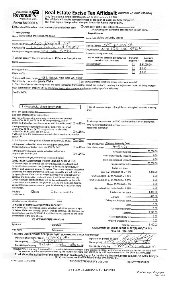 | 2 | 04/09/2021 | SWD | STATUTORY WARRANTY DEED | OJCIUS DANIEL & TERESA ANN | VIOLETTE LEO O & JUDITH J | | | $170,000.00 | 141299 | 2021-04149 |