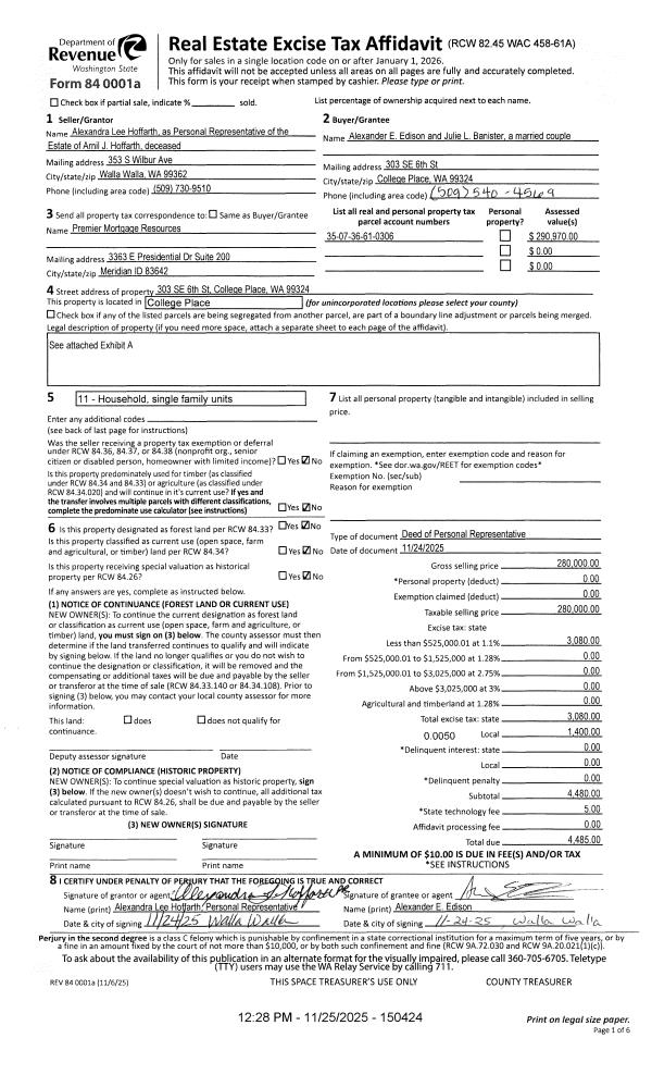 | 1 | 11/25/2025 | DPR | DEED OF PERSONAL REPRESENTATIVE | HOFFARTH ALEXANDRA LEE & KEVAN RAY HOFFARTH | EDISON ALEXANDER E & JULIE L BANISTER | | | $280,000.00 | 150424 | 2025-07304 |