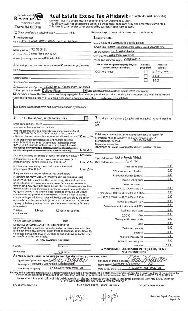 | 2 | 04/17/2025 | LOPA | LACK OF PROBATE AFFIDAVIT | HOFFARTH ARNIL J | HOFFARTH ALEXANDRA LEE & KEVAN RAY HOFFARTH | | | | 149252 | 2025-02034 |