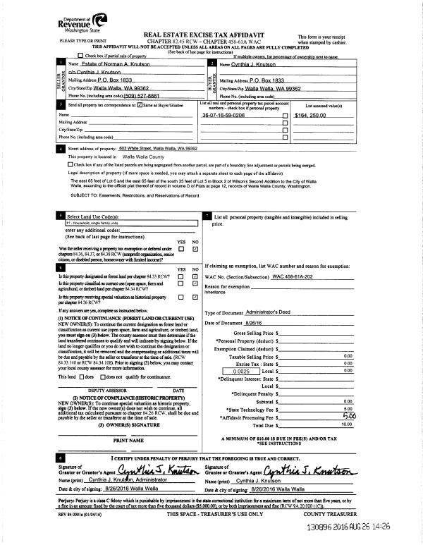 | 2 | 08/26/2016 | ADMD | ADMINISTRATOR'S DEED | KNUTSON NORMAN ESTATE OF | KNUTSON CYNTHIA J | | | $0.00 | 130896 | 2016-06862 |