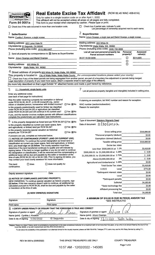 | 1 | 12/02/2022 | SWD | STATUTORY WARRANTY DEED | KNUTSON CYNTHIA J | OCAMPO ARTURO | | | $310,000.00 | 145085 | 2022-09457 |