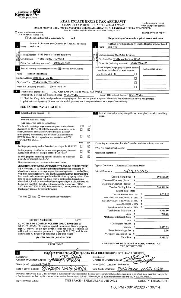 | 1 | 08/14/2020 | SWD | STATUTORY WARRANTY DEED | TACKETT JAMES R & CYNTHIA D | BREITHAUPT NATHAN & MICHELLE | | | $394,500.00 | 139714 | 2020-08090 |
