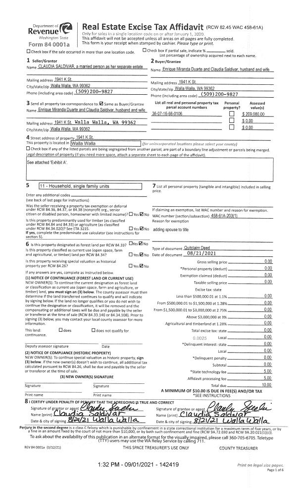 | 1 | 09/01/2021 | QCD | QUIT CLAIM DEED | SALDIVAR CLAUDIA | DUARTE ENRIQUE MIRANDA & CLAUDIA SALDIVAR | | | $0.00 | 142419 | 2021-10803 |