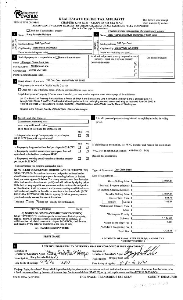 | 2 | 04/13/2016 | QCD | QUIT CLAIM DEED | HOLM STACY | MCINTYRE STACY RACHELLE | | | $73,027.00 | 130008 | 2016-02682 |
