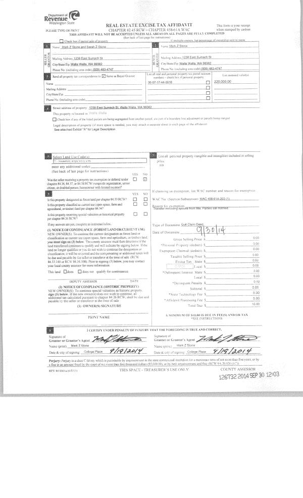 | 1 | 09/19/2014 | SWD | STATUTORY WARRANTY DEED | STONE MARK Z & SARAH Z | STONE MARK Z | | | | 126732 | 2014-07155 |
