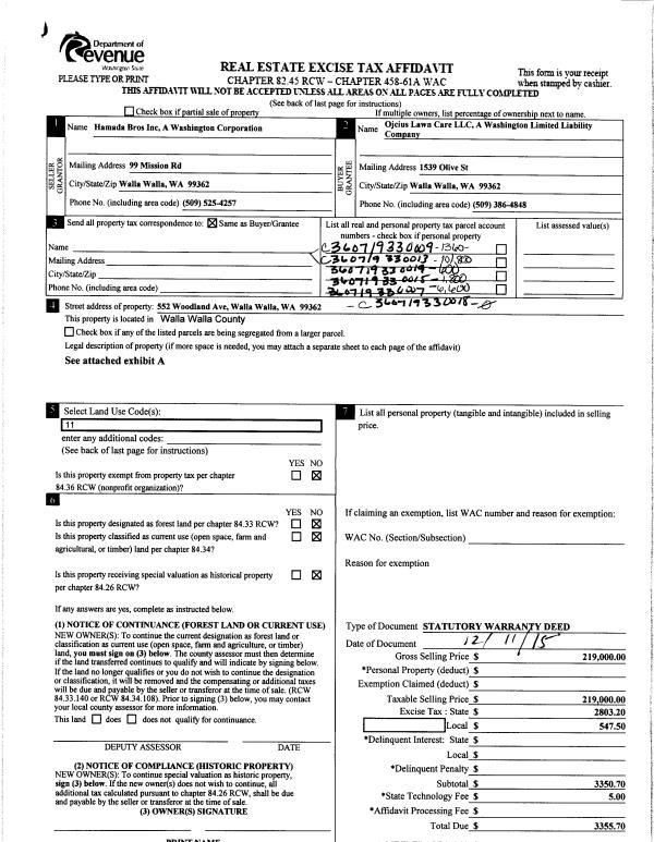| 1 | 12/23/2015 | SWD | STATUTORY WARRANTY DEED | HAMADA BROTHERS INC | OJCIUS LAWN CARE LLC | | 6-PARCELS | $219,000.00 | 129399 | 2015-10991 |