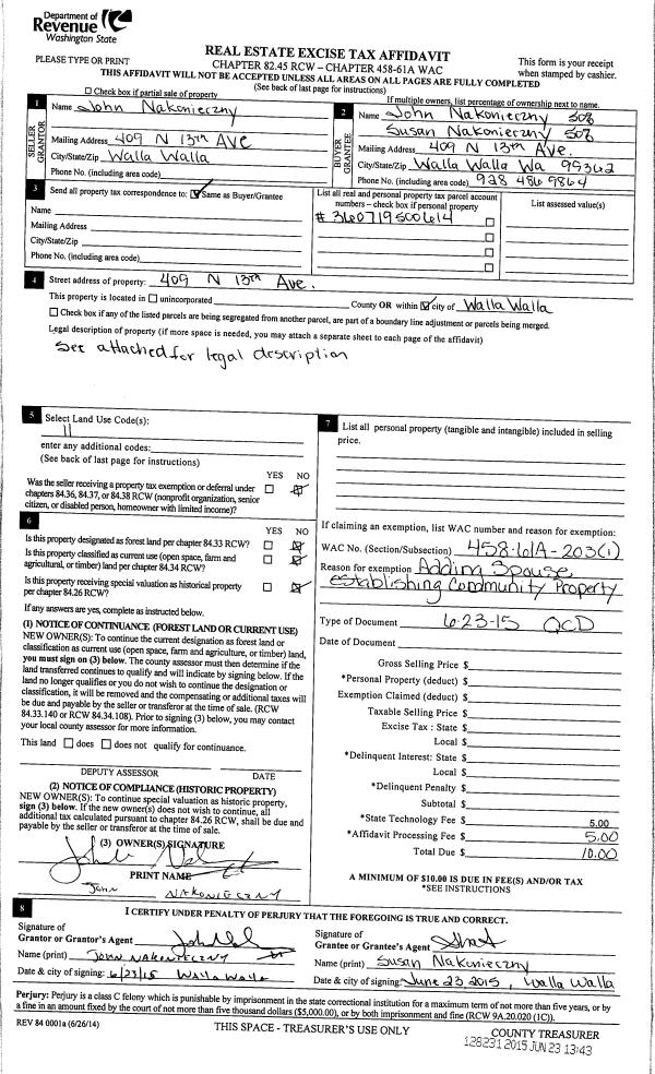 | 1 | 06/23/2015 | QCD | QUIT CLAIM DEED | NAKONIECZNY JOHN | NAKONIECZNY JOHN & SUSAN | | | | 128231 | 2015-05290 |