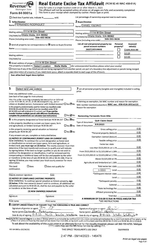 | Mailing Address: | DANIEL OSORIO 1114 W ELM ST WALLA WALLA, WA 99362 | % Ownership: | 100.0000000000% |