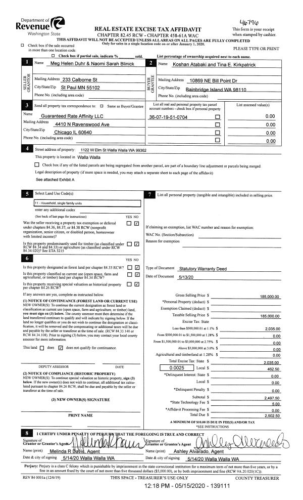 | 1 | 05/15/2020 | SWD | STATUTORY WARRANTY DEED | DUHR-SCHULTZ MEGELEN C | ATABAKI KOSHAN & TINA E KIRKPATRICK | | | $185,000.00 | 139111 | 2020-04244 |