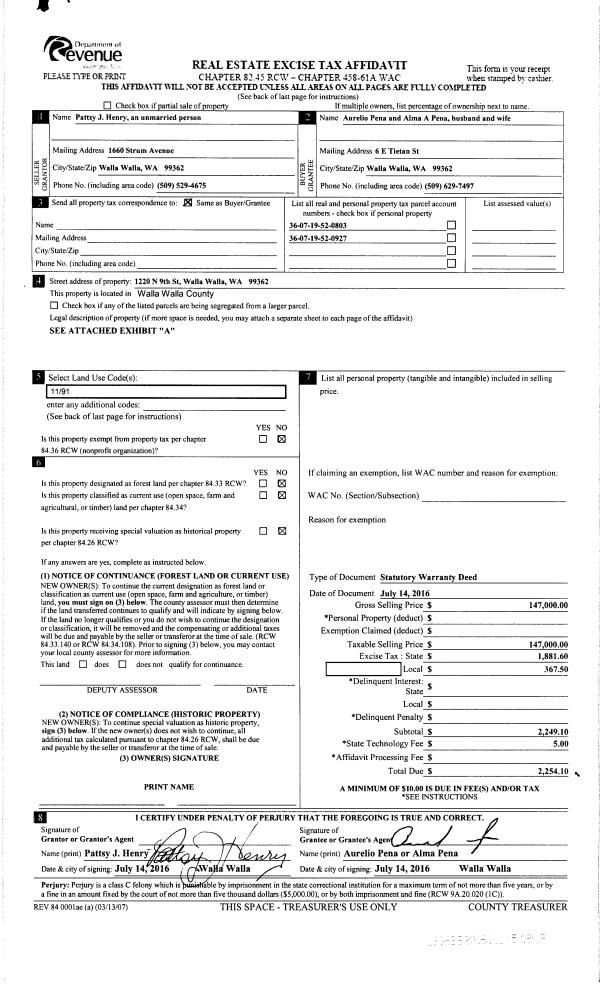 | 2 | 07/15/2016 | SWD | STATUTORY WARRANTY DEED | HENRY PATTSY J | PENA AURELIO & ALMA A | | 2-PARCELS | $147,000.00 | 130628 | 2016-05530 |