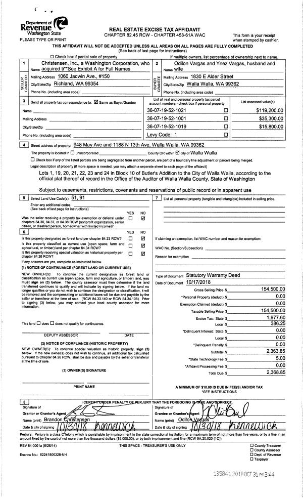 | 1 | 10/31/2018 | SWD | STATUTORY WARRANTY DEED | POWELL-CHRISTENSEN INC | VARGAS ODILON & YNEZ | | 3-PARCELS | $154,500.00 | 135841 | 2018-09033 |