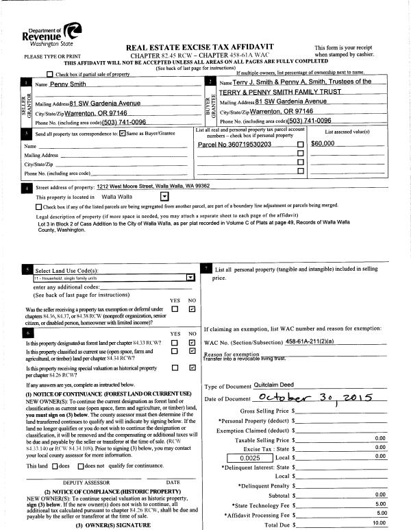 | 1 | 10/30/2015 | QCD | QUIT CLAIM DEED | SMITH PENNY | SMITH TERRY AND PENNY FAMILY TRUST | | | | 129169 | 2015-09790 |