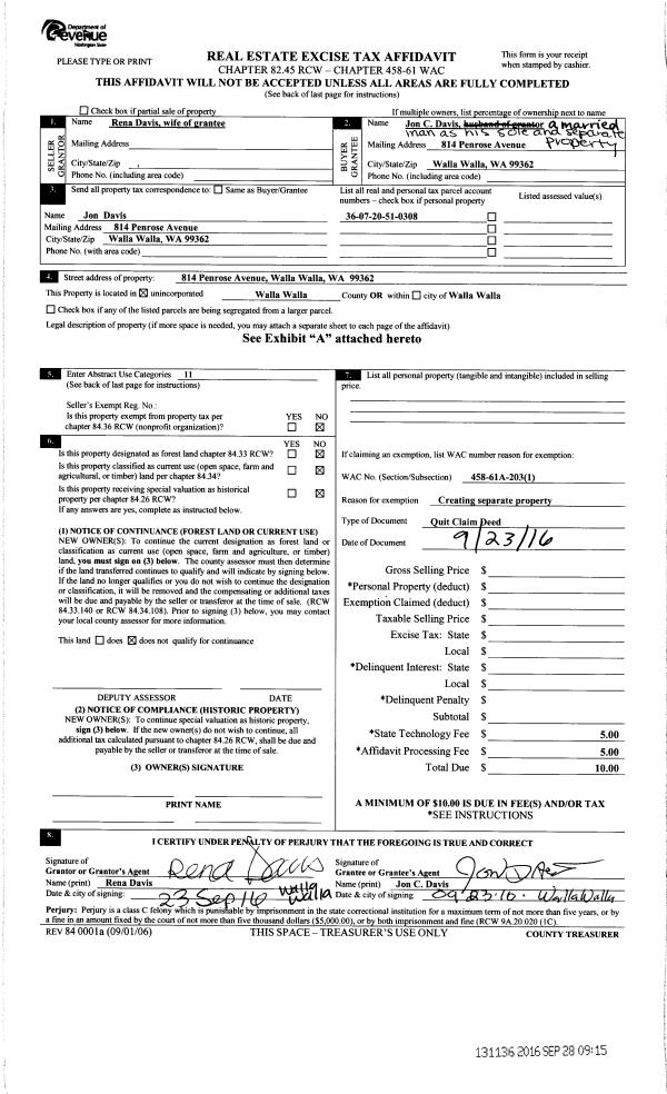 | 1 | 09/23/2016 | QCD | QUIT CLAIM DEED | DAVIS JON & RENA | DAVIS JON C | | | $0.00 | 131136 | 2016-07947 |