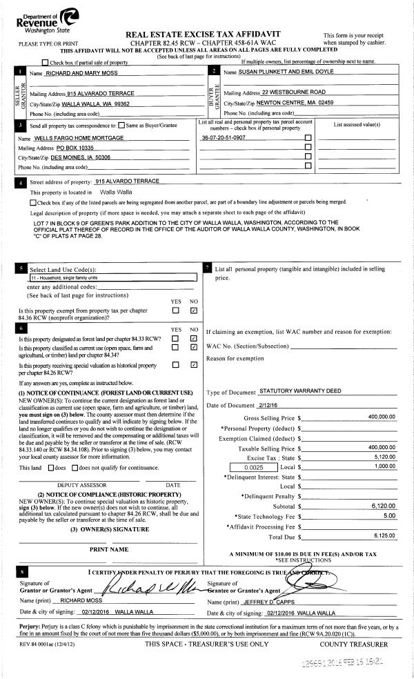 | 1 | 02/16/2016 | SWD | STATUTORY WARRANTY DEED | MOSS RICHARD & MARY | PLUNKETT SUSAN M | | | $400,000.00 | 129691 | 2016-01164 |