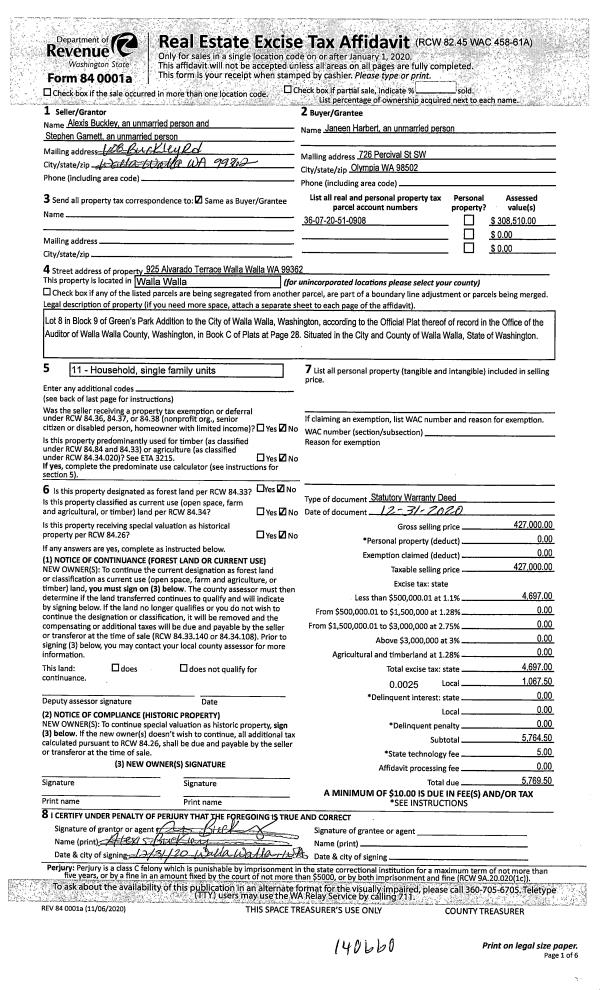 | 1 | 01/04/2021 | SWD | STATUTORY WARRANTY DEED | BUCKLEY ALEXIS | HARBERT JANEEN | | | $427,000.00 | 140660 | 2021-00026 |