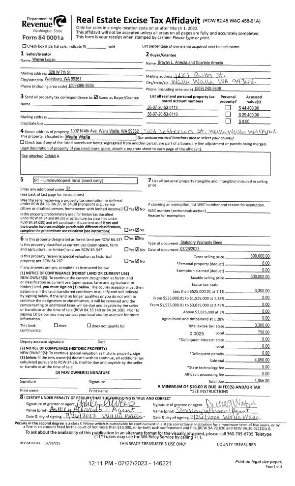 | 1 | 07/27/2023 | SWD | STATUTORY WARRANTY DEED | LOGAN WAYNE J | ARREOLA BRAYAN | | 2-PARCELS | $300,000.00 | 146221 | 2023-04254 |