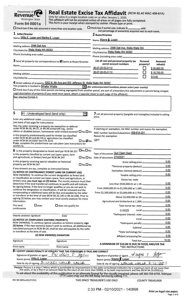| 2 | 02/10/2021 | QCD | QUIT CLAIM DEED | LOGAN WILLIS E | LOGAN WAYNE J | | | $0.00 | 140898 | 2021-01623 |