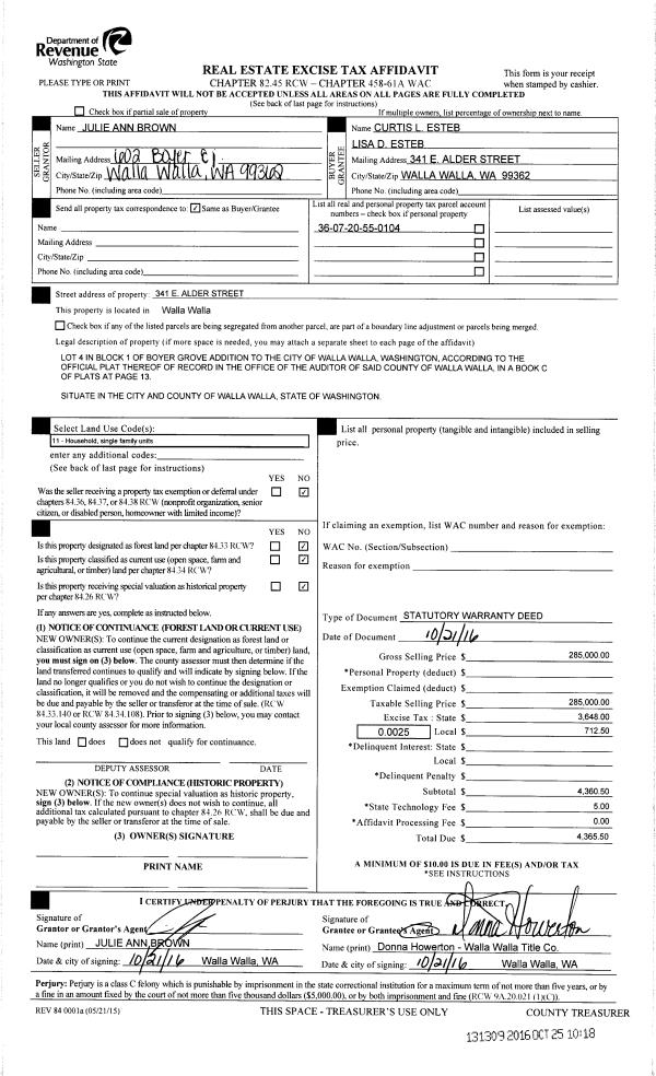 | 4 | 10/25/2016 | SWD | STATUTORY WARRANTY DEED | BROWN JULIE ANN | ESTEB CURTIS L & LISA D | | 2-PARCELS | $285,000.00 | 131309 | 2016-08832 |