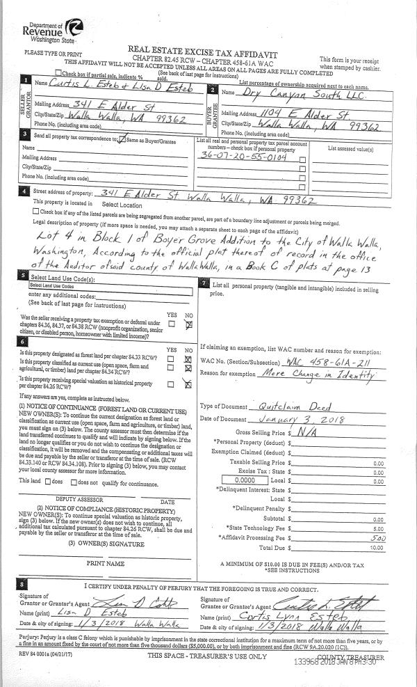 | 3 | 01/03/2018 | QCD | QUIT CLAIM DEED | ESTEB CURTIS L & LISA D | DRY CANYON SOUTH LLC | | 2 PARCELS | $0.00 | 133968 | 2018-00255 |