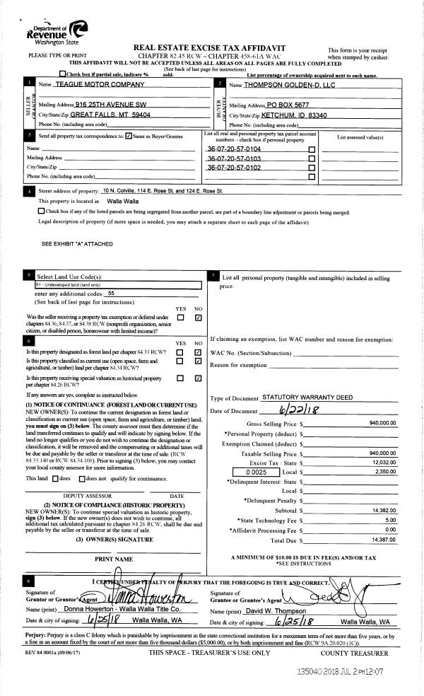 | 1 | 07/02/2018 | SWD | STATUTORY WARRANTY DEED | TEAGUE MOTOR CO | THOMPSON GOLDEN-D LLC | | 3-PARCELS | $940,000.00 | 135040 | 2018-05292 |