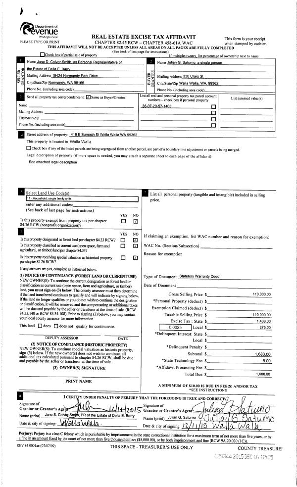 | 1 | 12/16/2015 | SWD | STATUTORY WARRANTY DEED | BARRY DELLA E ESTATE OF | SATURNO JULIAN G | | | $110,000.00 | 129344 | 2015-10734 |